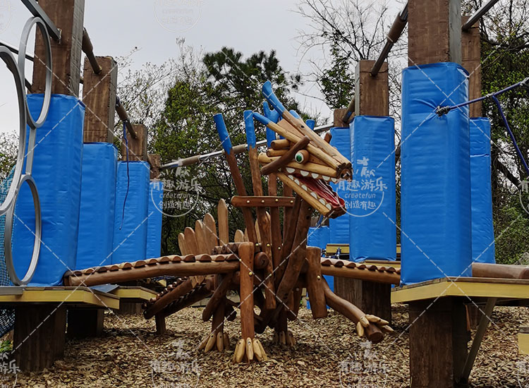 翼龍樂園區(qū)是利用客戶場(chǎng)地上原有的立柱,充分將廢棄的場(chǎng)地再度利用,讓已經(jīng)荒廢的場(chǎng)地重裝上陣,成為一個(gè)為用戶帶來快樂的新場(chǎng)地,我們?cè)陉惻f的立柱與立柱之間設(shè)計(jì)了各種造型的趣橋項(xiàng)目,同時(shí)打造生動(dòng)好玩的翼龍攀爬作為連接橋,讓我們的項(xiàng)目好玩又好看。