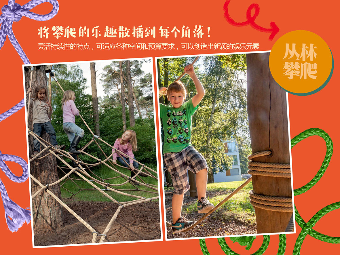 叢林攀爬項目以樹木自然生長的形式存在,為所有年齡的兒童和年輕人提供各種各樣玩耍、叢林攀爬的機會。 叢林攀爬項目可靈活的設(shè)置,使樹現(xiàn)有的生長或根系不被破壞。 在樹冠的光影中爬來爬去,給人一種特別被照顧的感覺,當樹梢在風(fēng)中沙沙作響,或小雨讓樹葉唱歌,這構(gòu)成了在叢林攀爬中玩耍成為一種整體的體驗。