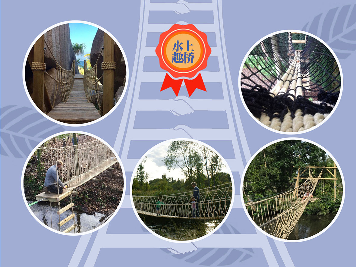 水上趣橋項目是在寧靜的河面上建起一座座有趣、橋體造型各異的小橋連接兩岸,使得此區(qū)域的游樂性能大增,其游樂焦點除了在色彩、造形上給人耳目一新的感覺外,水上趣橋的特點是游人參與性強,過橋的難易程度很具挑戰(zhàn)性,有令人恐高的五環(huán)橋;也有集體力、平衡力于一體的吊樁橋;有嘗試體形靈活性的鉆圈橋;也有意義獨具的要雙人攜手才能過的情侶橋等等,對不同年齡、興趣、膽量的人都有極高吸引力,并且名稱的設(shè)計具有獨特的含義,水上趣橋是每一處有水面的場地必備橋類項目。