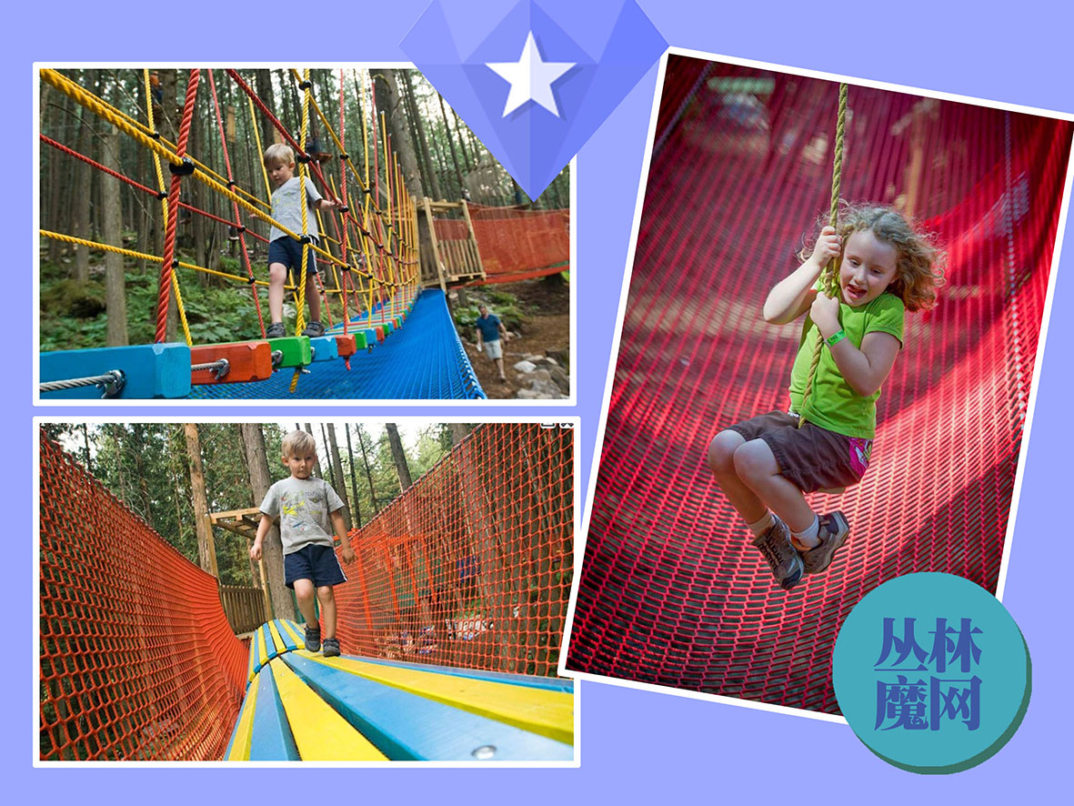 叢林魔網(wǎng)(叢林繩網(wǎng))可以成為所有年齡段人群夢幻般樂趣的來源,可以全家一同享受的無動力游樂項目。叢林繩網(wǎng)被設(shè)計為可供大多數(shù)人使用,但需要適當程度的體力支出和精神挑戰(zhàn)。
