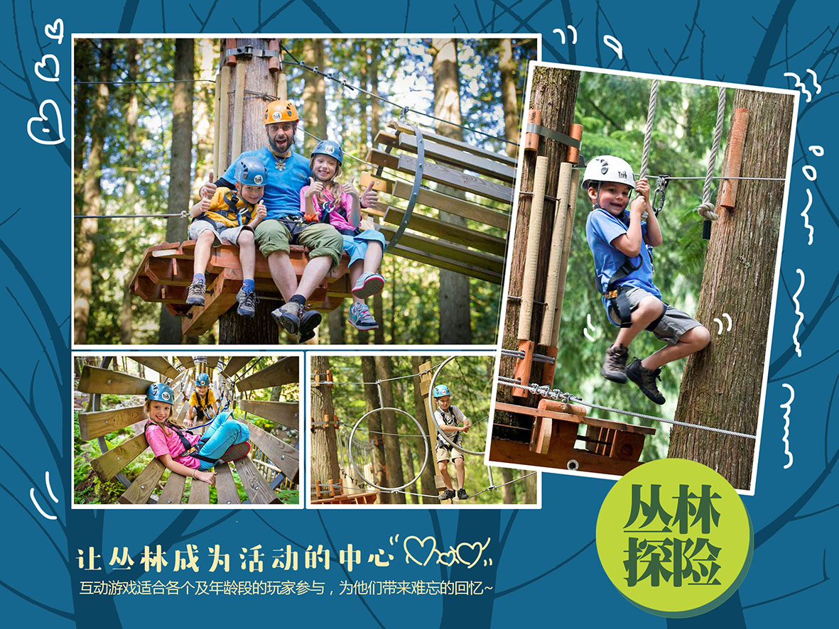 叢林探險(樹上探險)項目是在大樹之間設(shè)置的運動繩索、軟橋或繩網(wǎng)等有挑戰(zhàn)的項目,使人們在繩網(wǎng)上搖擺和嬉戲,或者通過從一棵樹到另一棵樹上擺動的吊橋。